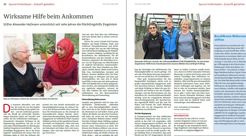 Unter dem Motto „Spuren hinterlassen – Zukunft gestalten“ ist im September 2025 im Presseverbund Nordbayern der Artikel „Wirksame Hilfe beim Ankommen“ erschienen. Anlass war das 10-jährige Engagement der in.media.vitae foundation in der Flüchtlingshilfe im Nürnberger Stadtteil Ziegelstein. Auf Minijob-Basis koordinieren Susanne Mahlein und Birgit Frühling mit Hilfe des zugehörigen Arbeitskreises einen Helferkreis von über 100 Ehrenamtlichen, davon sind etwa 35 dauernd aktiv. In zwei großen Unterkünften für insgesamt über 500 Geflüchtete werden eine große Bandbreite an helfenden Aktivitäten mit oft unermüdlichem Einsatz geleistet.